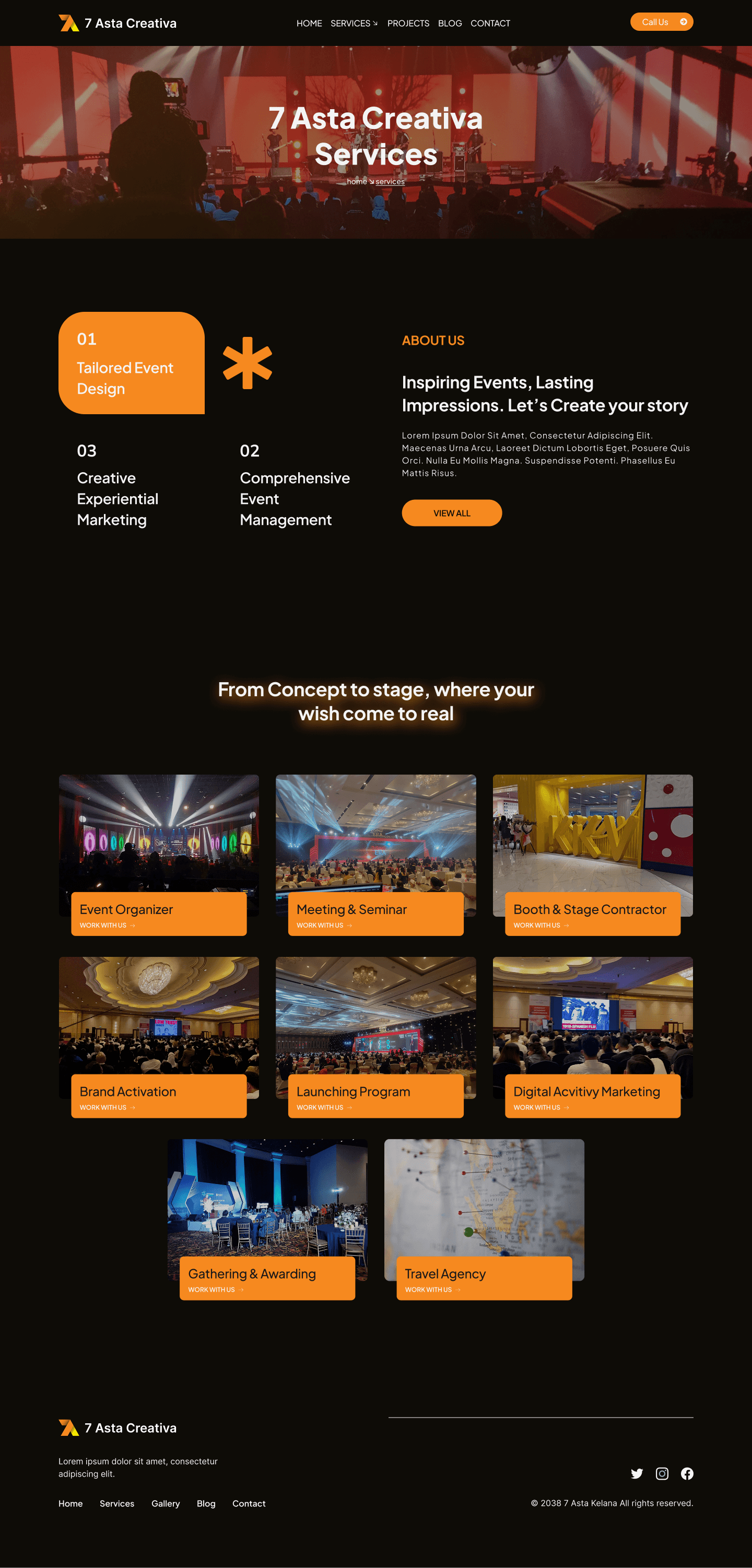 Introduces the brand with a strong hero section, service highlights, project previews, and clear calls to action.Services